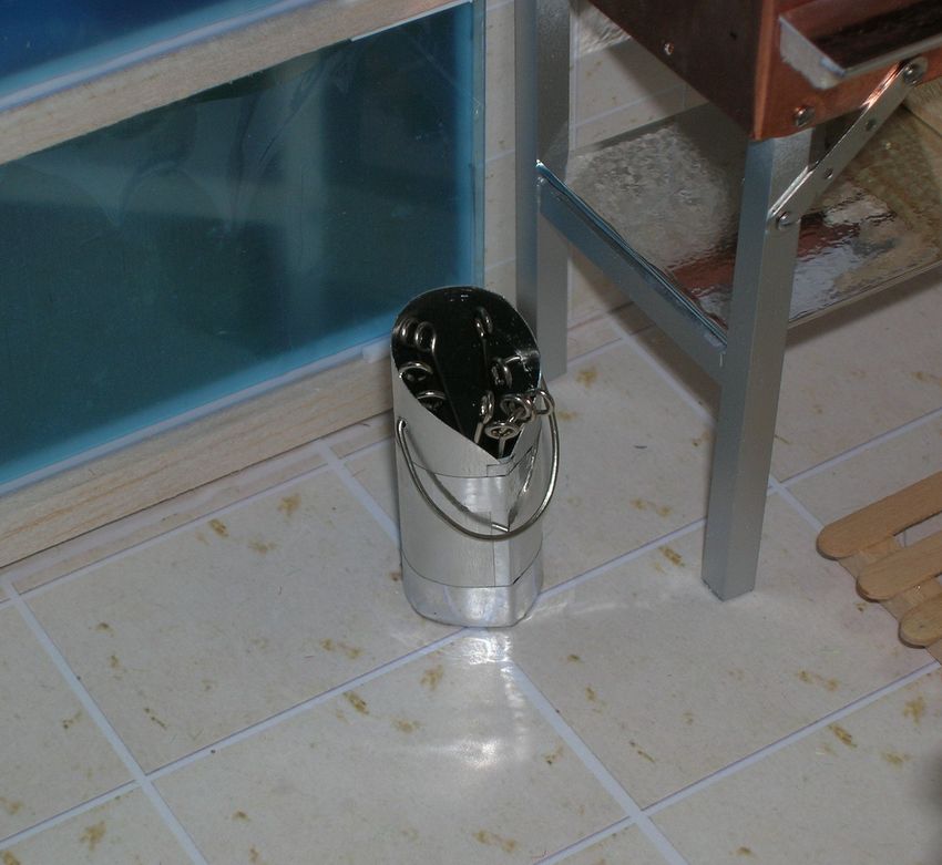 Mangalı ve üst kısmını gerçek bakır levhadan ölçeğine uygun bir şekilde kesip şekillendirdim. Altına metal görünümlü ayaklar ekleyip metal parçalar ve vidalarla sabitledim.Hemen altına yakılacak olan tahta parçaları ve ustanın üzerine çıkıp durması için ahşaptan bir yükselti oluşturdum. Hemen yan tarafta ise kirli şişleri içine koymak üzere yapılmış tenekeden bir şişlik.Mangalın üzerinde tenekeden bir baca sistemi ve camın üzerine monte edilmiş bir vantilatör de mevcut.Mangal içerisindeki kömürler bir led yardımı ile yanıyormuş gibi görünmekte ve de camdaki vantilatör çalışmakta.